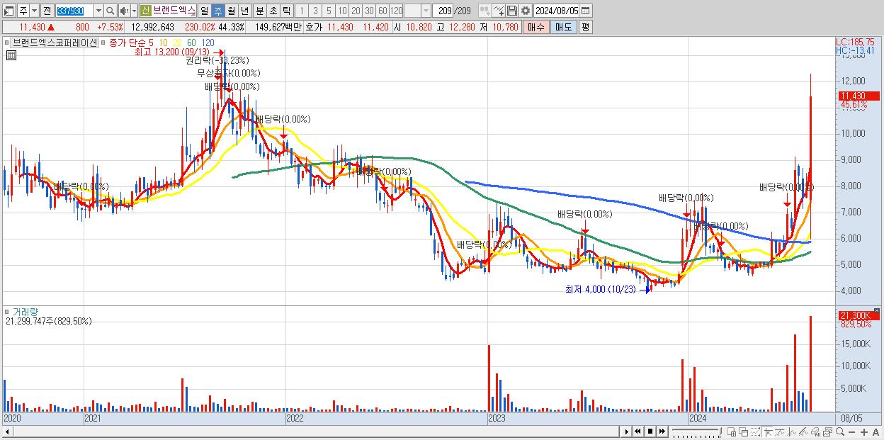 - 브랜드엑스코퍼레이션 (11,430원 ▲ 45.61% , 시총: 3,350억, 거래량: 21,299,747, 거래대금:2,264억)