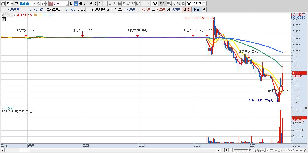 - DXVX (4,020원 ▲ 34% , 시총: 1,215억, 거래량: 39,310,716, 거래대금:1,598억)