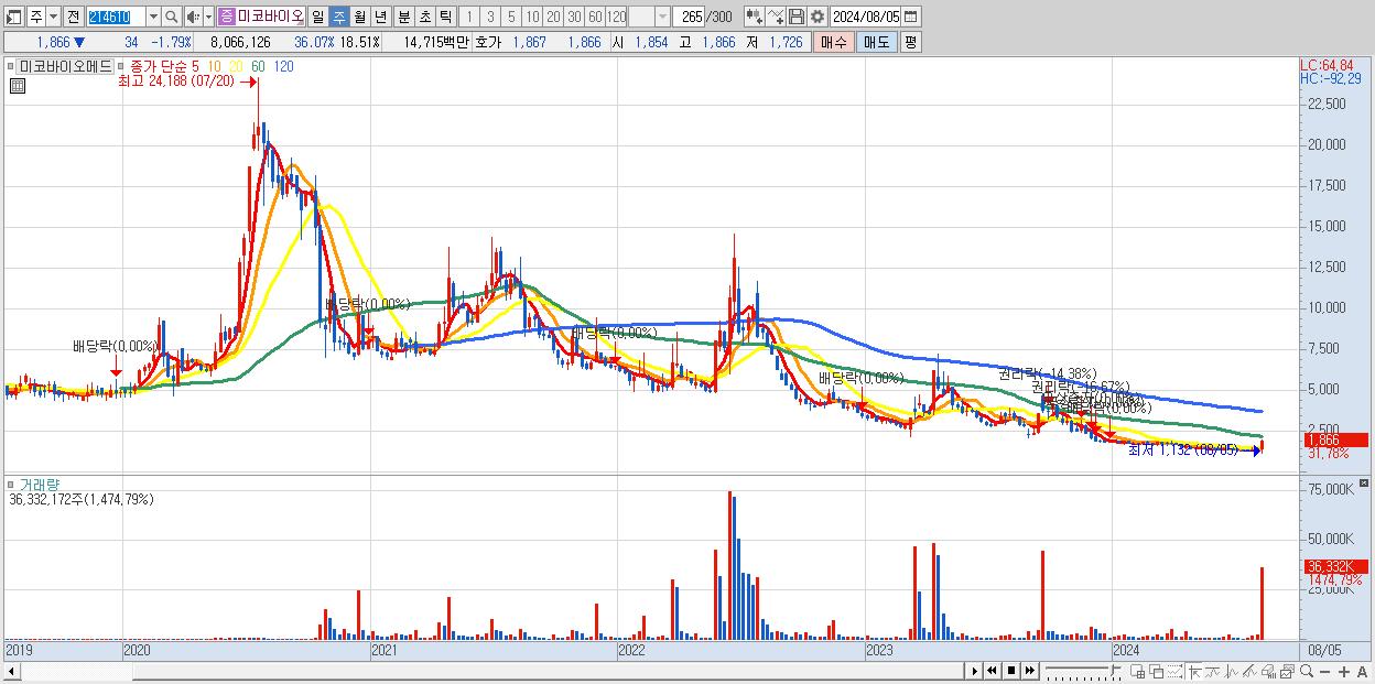 - 미코바이오메드 (1,866원 ▲ 31.78% , 시총: 813억, 거래량: 36,332,172, 거래대금:641억)
