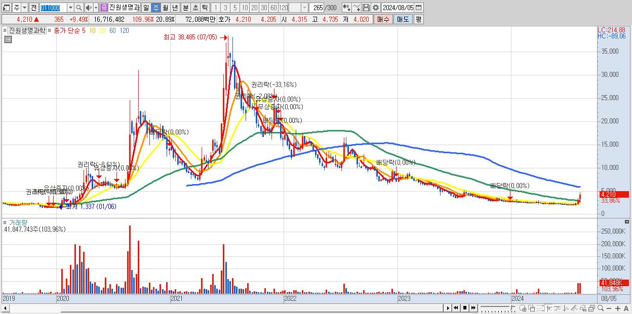 - 진원생명과학 (4,210원 ▲ 33.86% , 시총: 3,370억, 거래량: 41,847,743, 거래대금:1,601억)