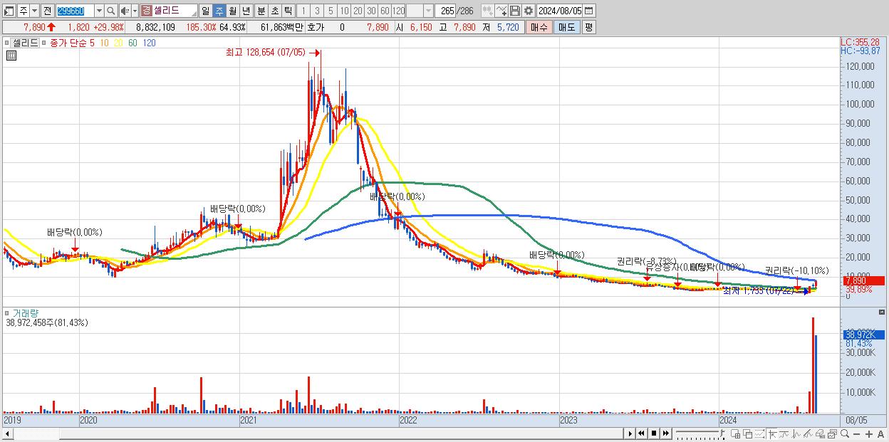 - 셀리드 (7,890원 ▲ 39.89% , 시총: 1,073억, 거래량: 38,972,458, 거래대금:2,549억)