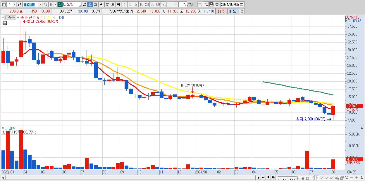 - 나노팀 (12,040원 ▲ 27.68% , 시총: 2,375억, 거래량: 4,137,119, 거래대금:457억)