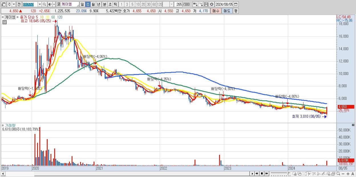 - 케이엠 (4,650원 ▲ 26.7% , 시총: 575억, 거래량: 6,619,080, 거래대금:291억)