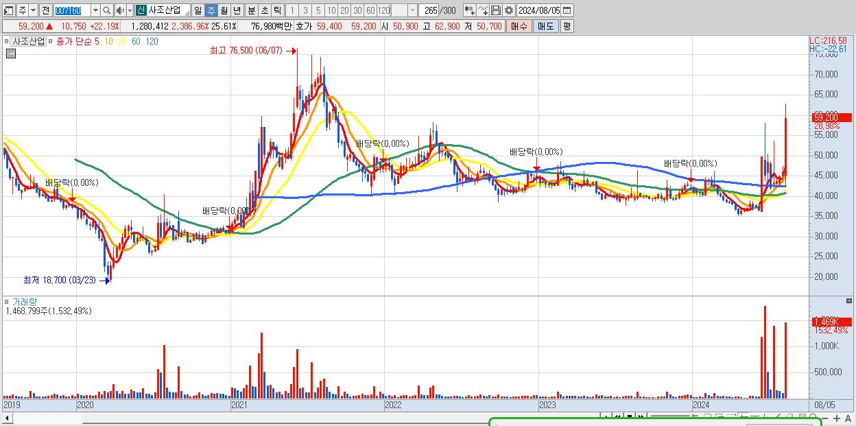 - 사조산업 (59,200원 ▲ 28.98% , 시총: 2,960억, 거래량: 1,468,799, 거래대금:859억)