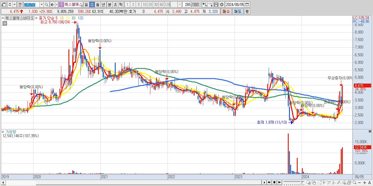 - 에스엘에스바이오 (4,475원 ▲ 34.38% , 시총: 687억, 거래량: 12,543,146, 거래대금:494억)