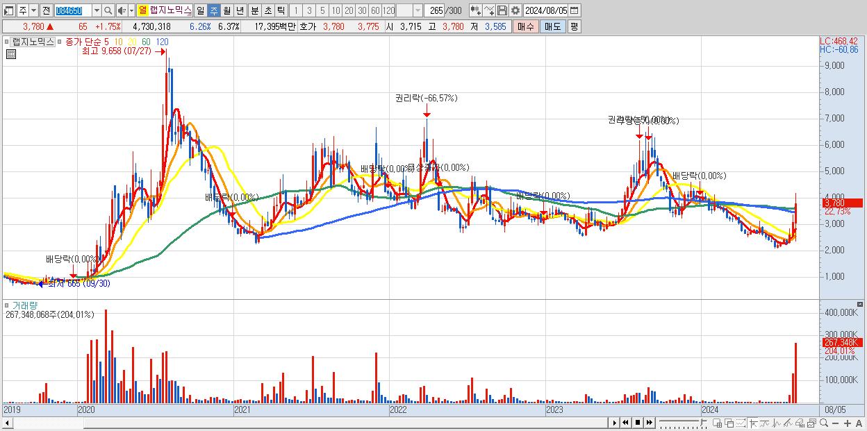 - 랩지노믹스 (3,780원 ▲ 22.73% , 시총: 2,806억, 거래량: 267,348,068, 거래대금:9,412억)