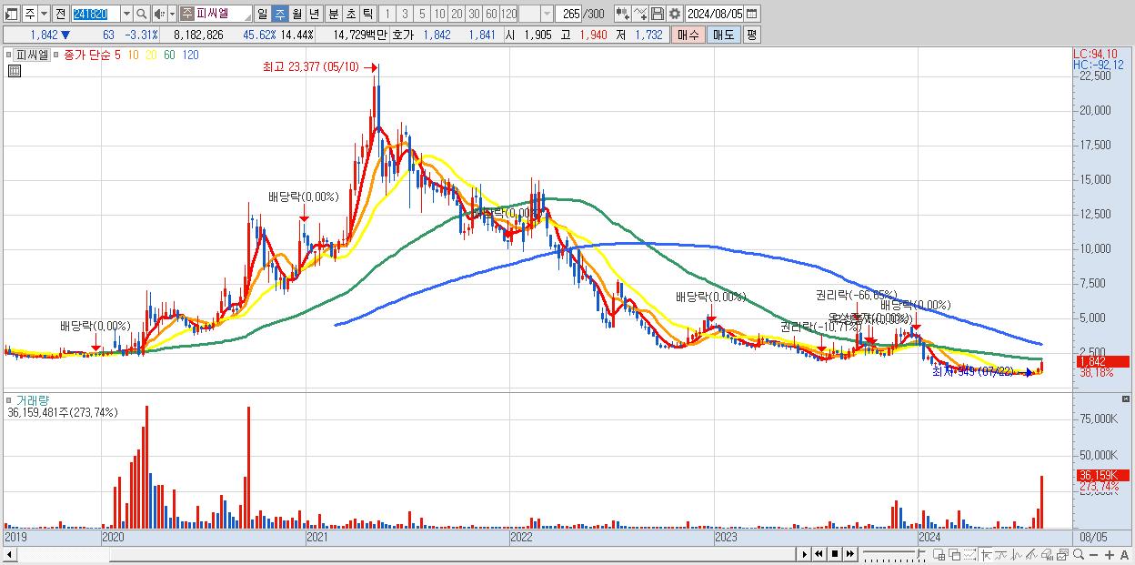 - 피씨엘 (1,842원 ▲ 38.18% , 시총: 1,044억, 거래량: 36,159,481, 거래대금:612억)