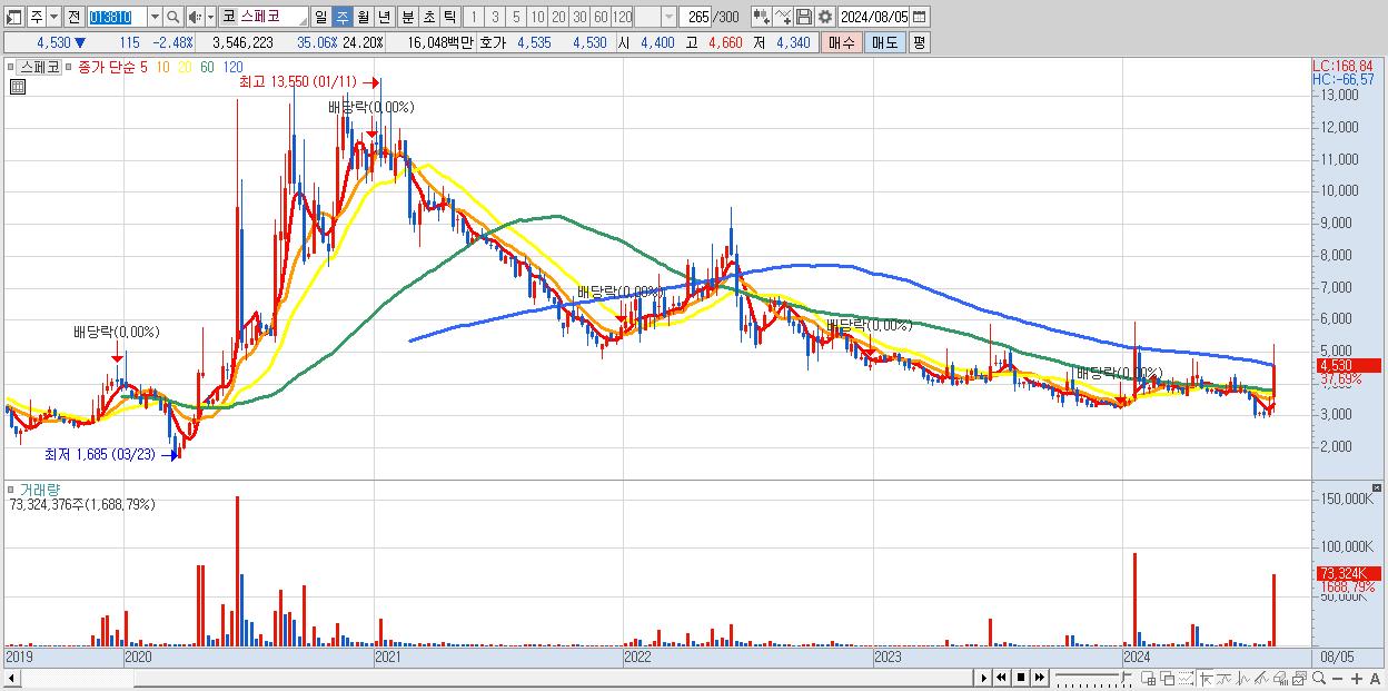 - 스페코 (4,530원 ▲ 37.69% , 시총: 664억, 거래량: 73,324,376, 거래대금:3,264억)