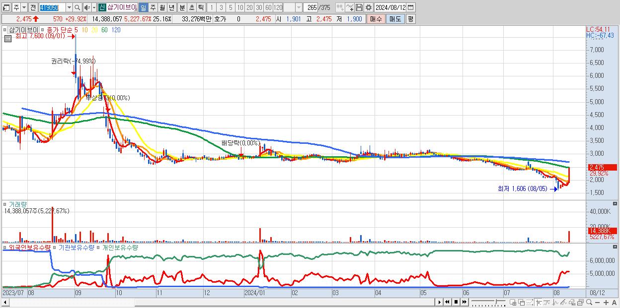 - 삼기이브이 (2,475원 ▲ 29.92% , 시총: 1,416억, 거래량: 14,388,057, 거래대금:333억)