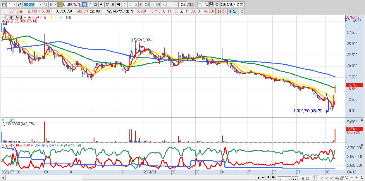 - 미래반도체 (15,710원 ▲ 15.68% , 시총: 2,268억, 거래량: 3,233,558, 거래대금:521억)