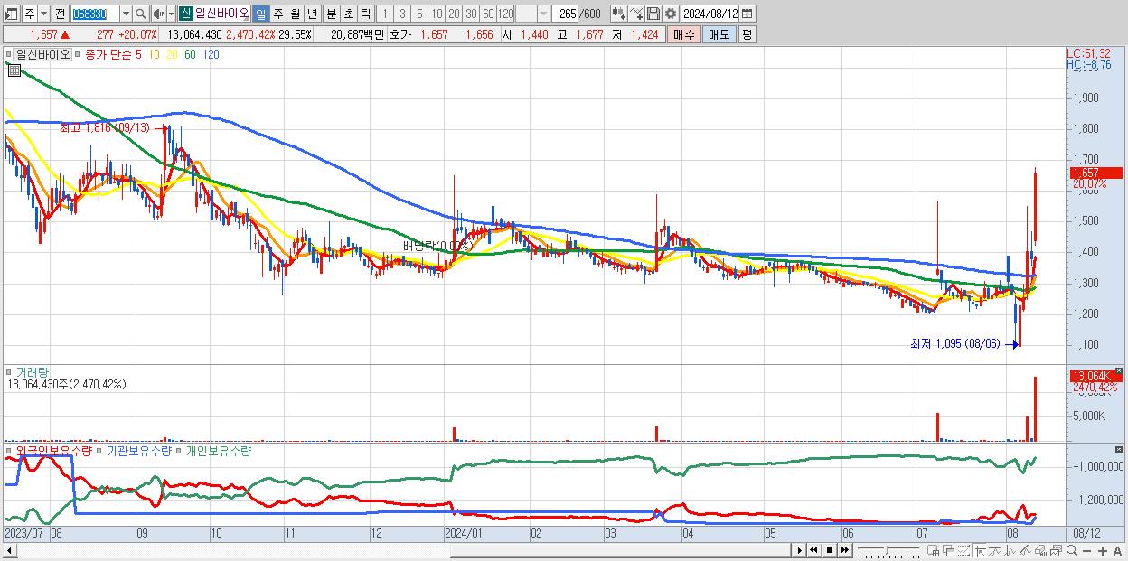 - 일신바이오 (1,657원 ▲ 20.07% , 시총: 733억, 거래량: 13,064,430, 거래대금:209억)