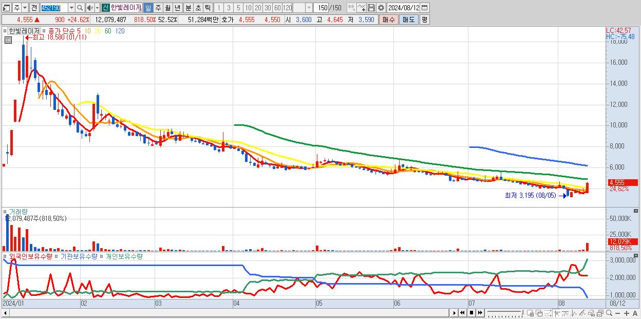 - 한빛레이저 (4,555원 ▲ 24.62% , 시총: 1,048억, 거래량: 12,079,487, 거래대금:513억)