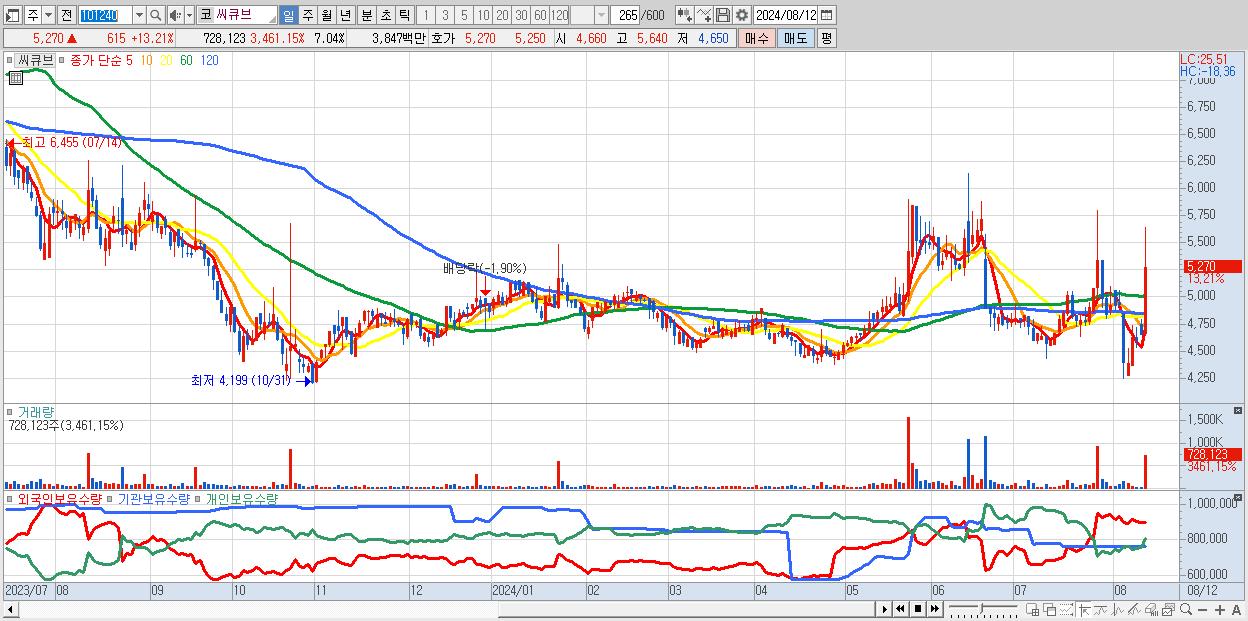 - 씨큐브 (5,270원 ▲ 13.21% , 시총: 545억, 거래량: 728,123, 거래대금:38억)