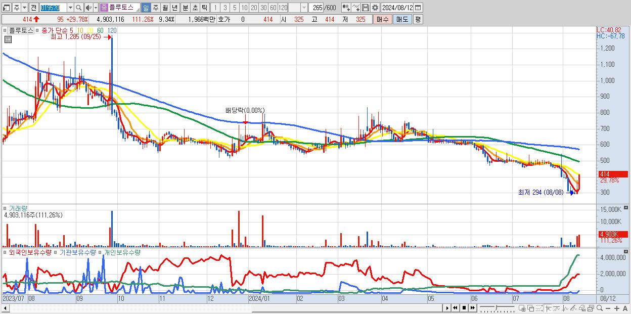 - 플루토스 (414원 ▲ 29.78% , 시총: 217억, 거래량: 4,903,116, 거래대금:20억)