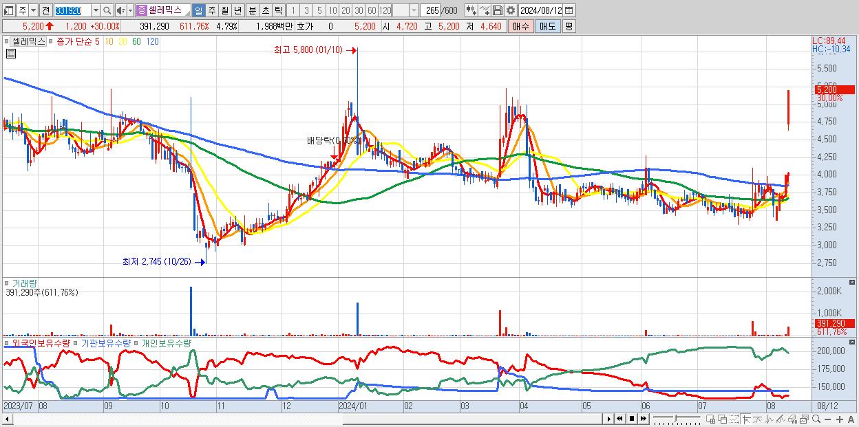 - 셀레믹스 (5,200원 ▲ 30% , 시총: 425억, 거래량: 391,290, 거래대금:20억)