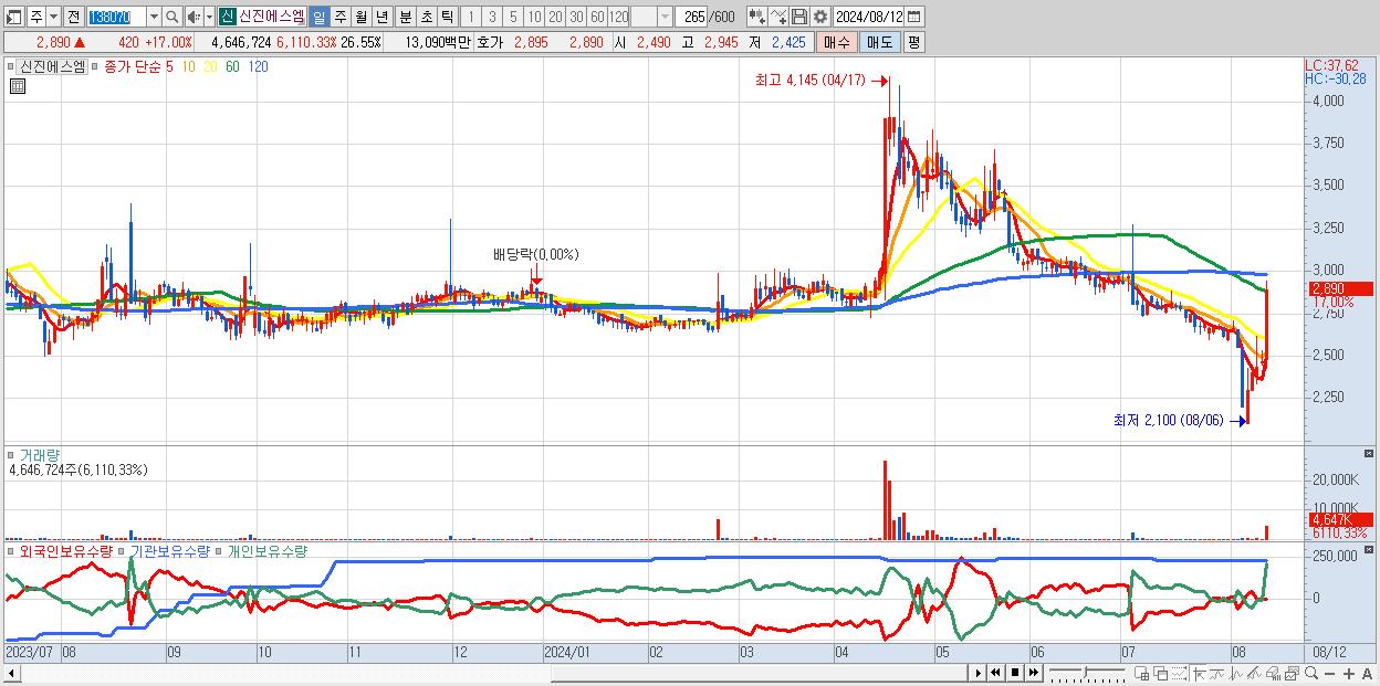 - 신진에스엠 (2,890원 ▲ 17% , 시총: 506억, 거래량: 4,646,724, 거래대금:131억)