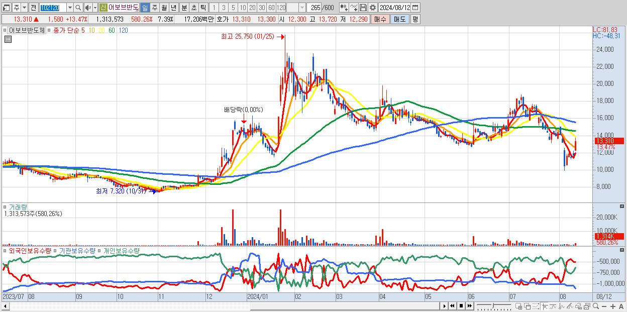 - 어보브반도체 (13,310원 ▲ 13.47% , 시총: 2,367억, 거래량: 1,313,573, 거래대금:172억)
