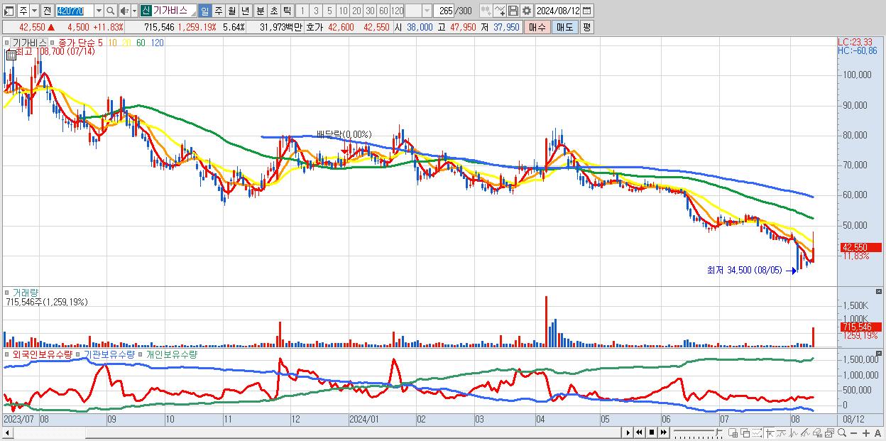 - 기가비스 (42,550원 ▲ 11.83% , 시총: 5,394억, 거래량: 715,546, 거래대금:320억)