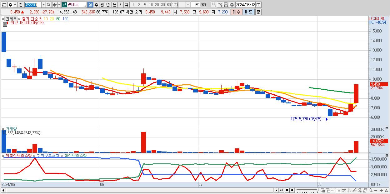 - 민테크 (9,450원 ▲ 27.7% , 시총: 2,074억, 거래량: 14,652,148, 거래대금:1,267억)