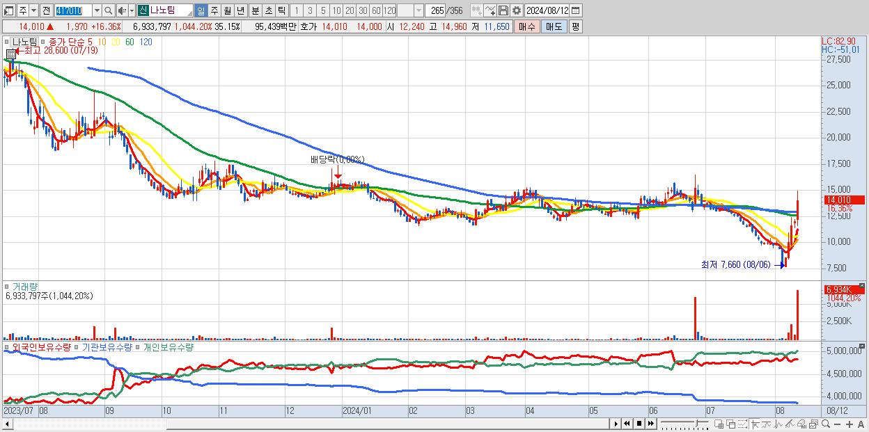 - 나노팀 (14,010원 ▲ 16.36% , 시총: 2,763억, 거래량: 6,933,797, 거래대금:954억)