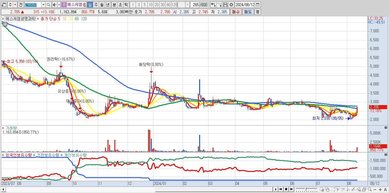 - 에스씨엠생명과학 (2,705원 ▲ 13.18% , 시총: 554억, 거래량: 1,163,894, 거래대금:31억)