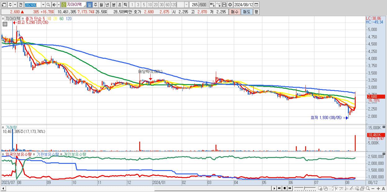 - 지아이텍 (2,680원 ▲ 16.78% , 시총: 1,055억, 거래량: 10,461,385, 거래대금:285억)