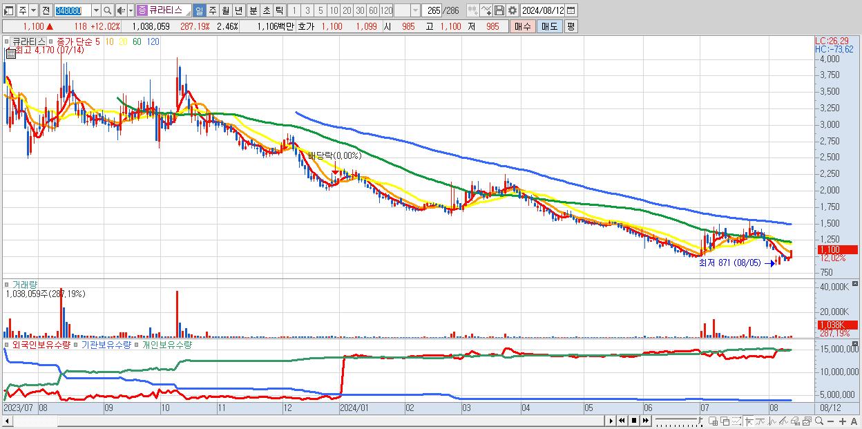 - 큐라티스 (1,100원 ▲ 12.02% , 시총: 464억, 거래량: 1,038,059, 거래대금:11억)
