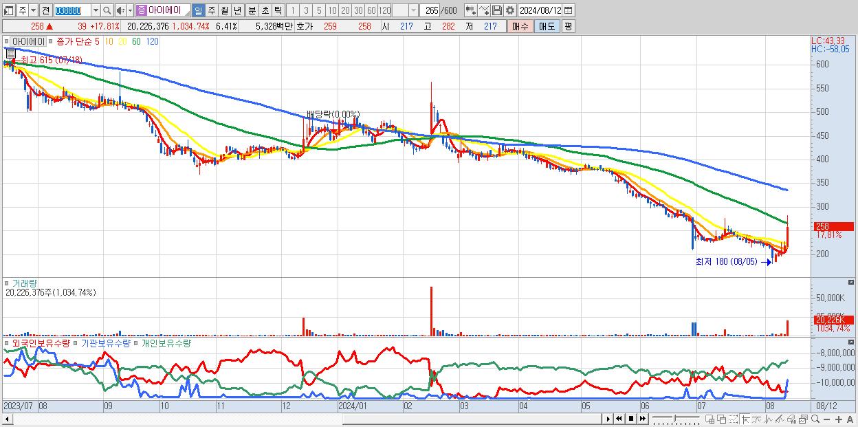 - 아이에이 (258원 ▲ 17.81% , 시총: 814억, 거래량: 20,226,376, 거래대금:53억)