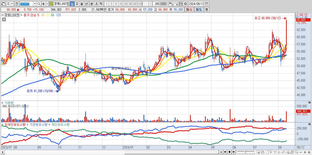 - 경동나비엔 (66,000원 ▲ 15.18% , 시총: 9,615억, 거래량: 344,363, 거래대금:219억)