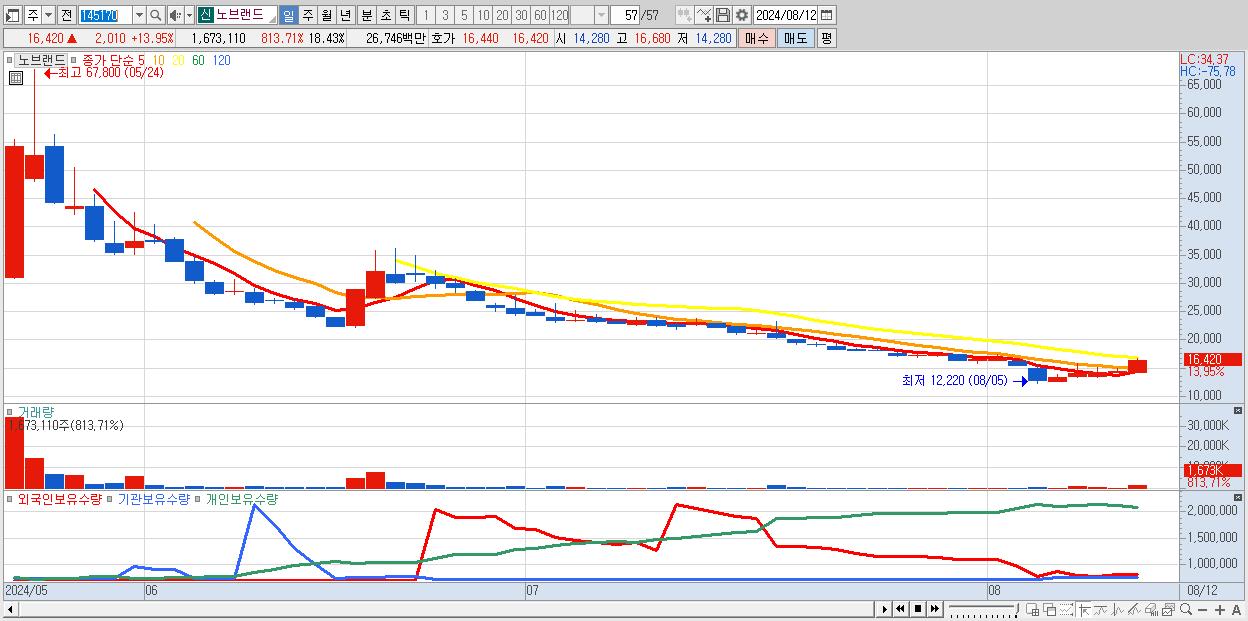 - 노브랜드 (16,420원 ▲ 13.95% , 시총: 1,491억, 거래량: 1,673,110, 거래대금:267억)