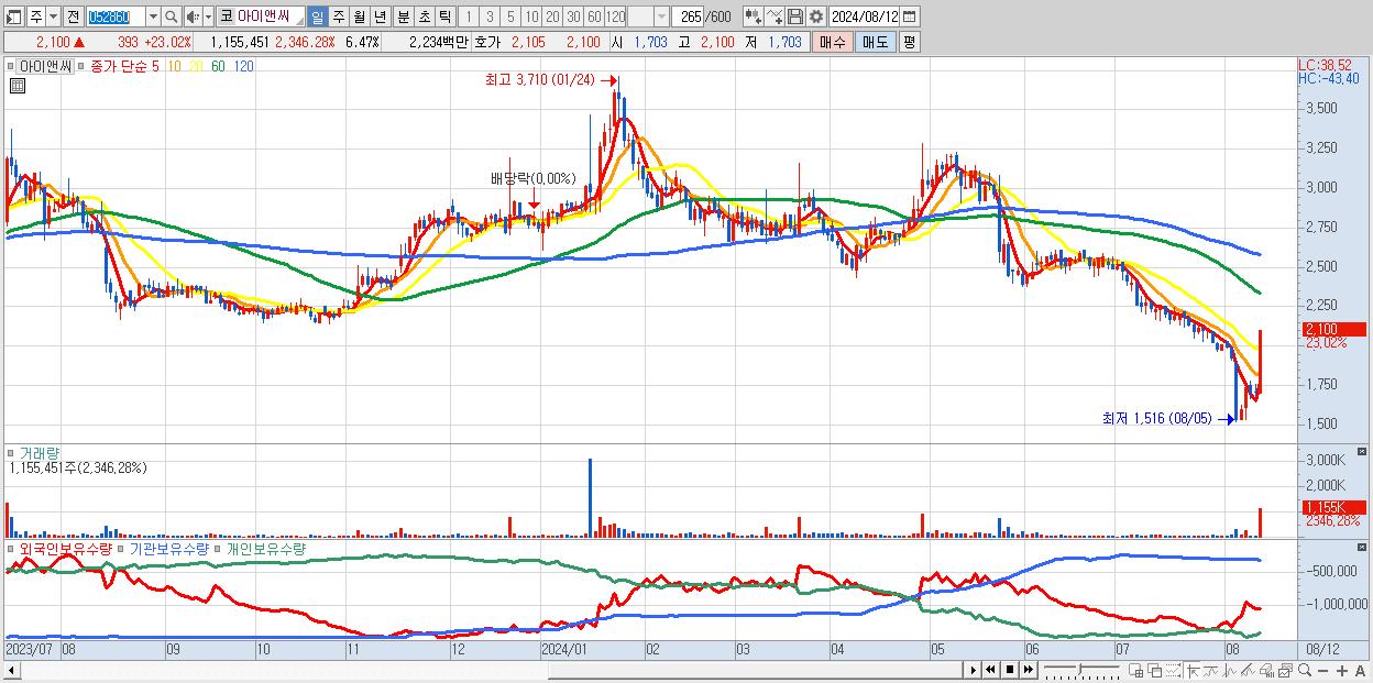 - 아이앤씨 (2,100원 ▲ 23.02% , 시총: 375억, 거래량: 1,155,451, 거래대금:22억)