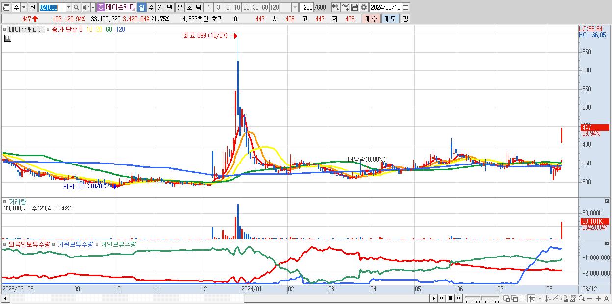 - 메이슨캐피탈 (447원 ▲ 29.94% , 시총: 680억, 거래량: 33,100,720, 거래대금:146억)