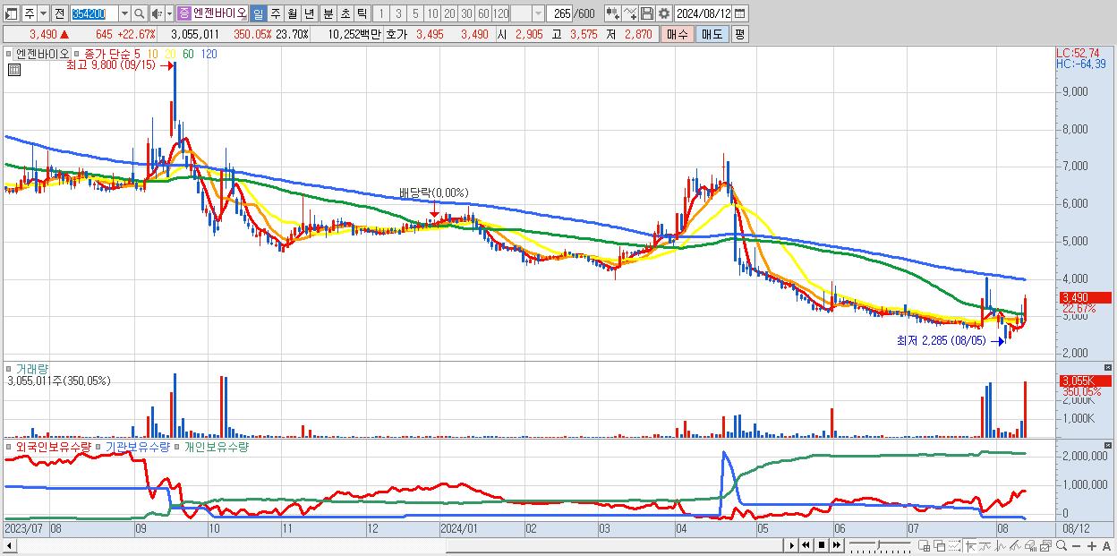 - 엔젠바이오 (3,490원 ▲ 22.67% , 시총: 450억, 거래량: 3,055,011, 거래대금:103억)