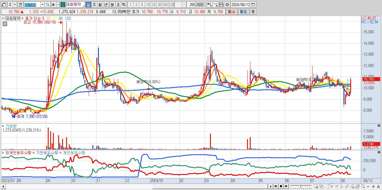 - 대화제약 (10,780원 ▲ 13.83% , 시총: 2,007억, 거래량: 1,273,624, 거래대금:136억)