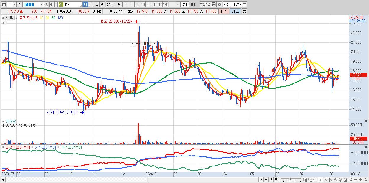 - HMM (17,570원 ▲ 1.15% , 시총: 131,606억, 외국인 순매수 거래금:30억)