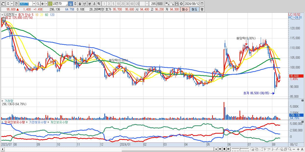 - LG전자 (95,600원 ▲ 1.49% , 시총: 156,447억, 외국인 순매수 거래금:45억)