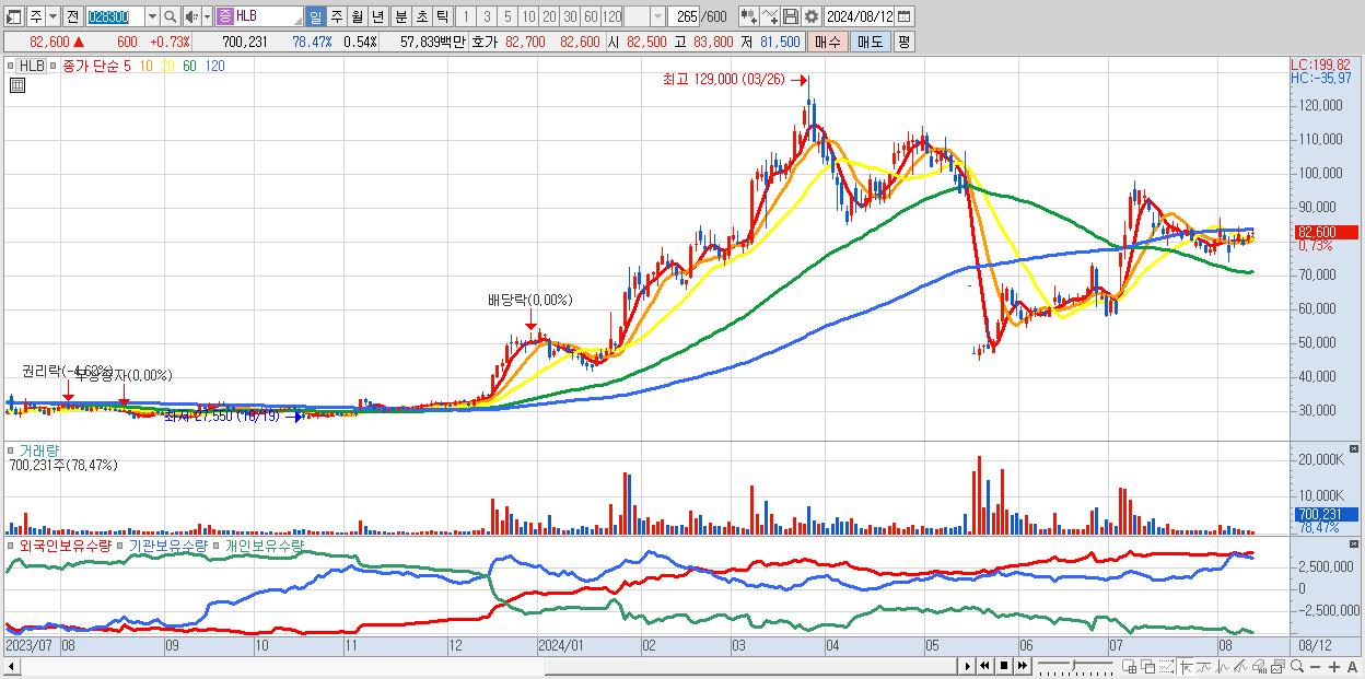 - HLB (82,600원 ▲ 0.73% , 시총: 108,078억, 외국인 순매수 거래금:65억)