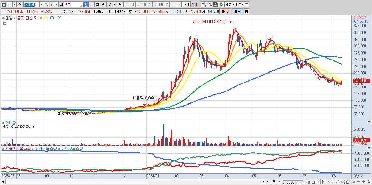 - 엔켐 (173,000원 ▲ 6.92% , 시총: 35,961억, 외국인 순매수 거래금:46억)