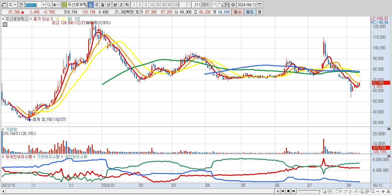 - 두산로보틱스 (67,300원 ▲ 3.7% , 시총: 43,624억, 외국인 순매수 거래금:44억)
