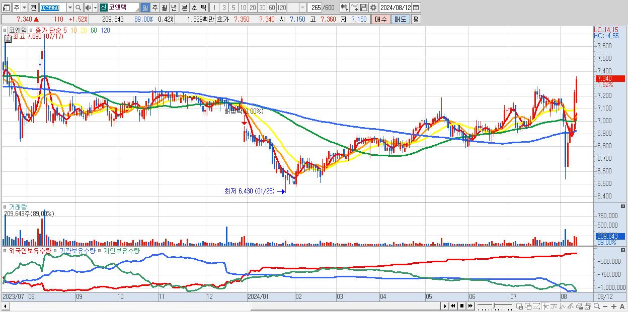 코엔텍 7,340원 ▲ 1.52% (KOSDAQ, 029960)