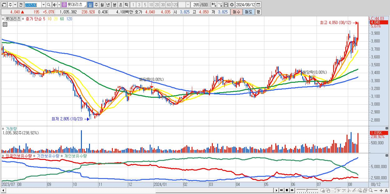 - 롯데리츠 (4,040원 ▲ 5.07% , 시총: 9,816억, 거래량: 1,035,382, 거래대금:41억, KOSPI)