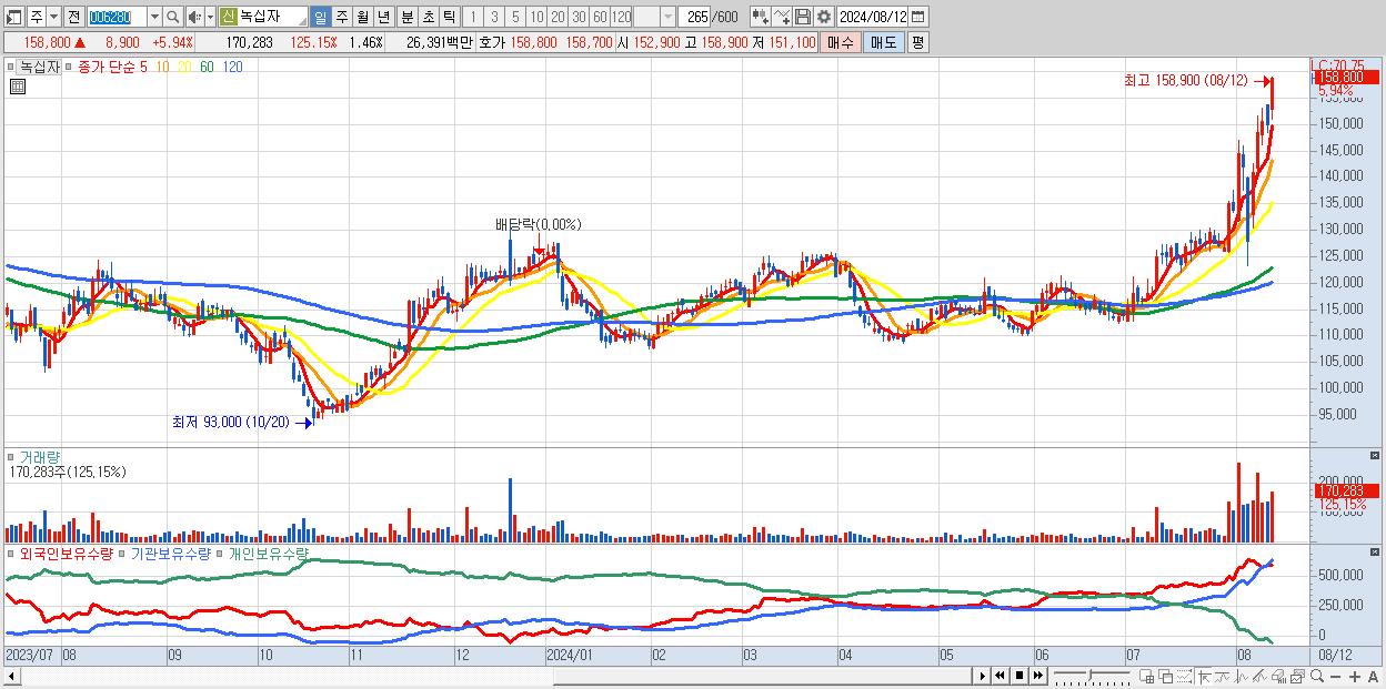 - 녹십자 (158,800원 ▲ 5.94% , 시총: 18,558억, 거래량: 170,283, 거래대금:264억, KOSPI)