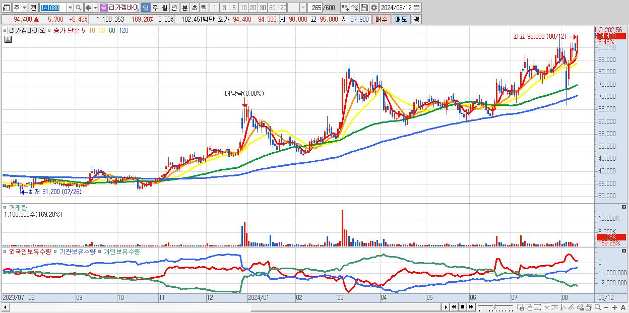 - 리가켐바이오 (94,400원 ▲ 6.43% , 시총: 34,520억, 거래량: 1,108,353, 거래대금:1,025억, KOSDAQ)