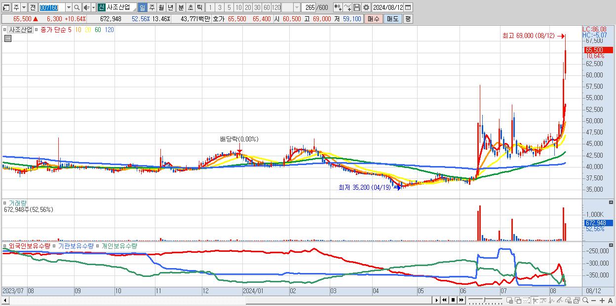 - 사조산업 (65,500원 ▲ 10.64% , 시총: 3,275억, 거래량: 672,948, 거래대금:438억, KOSPI)
