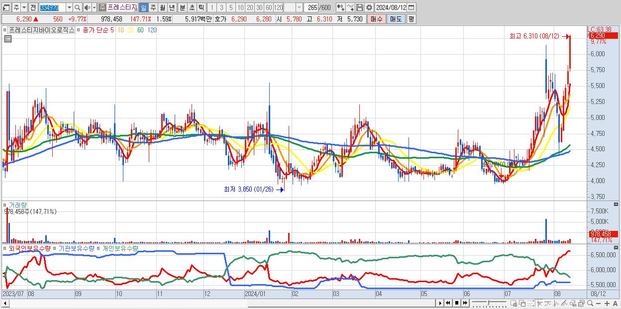 - 프레스티지바이오로직스 (6,290원 ▲ 9.77% , 시총: 3,868억, 거래량: 978,458, 거래대금:59억, KOSDAQ)