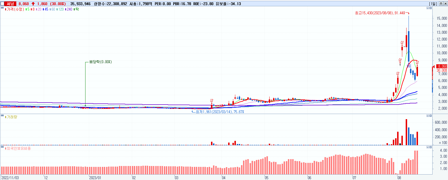 - 서남 (8,060원 ▲ 30% , 시총: 1,798억, 거래량: 35,933,946, 거래대금:2,693억)