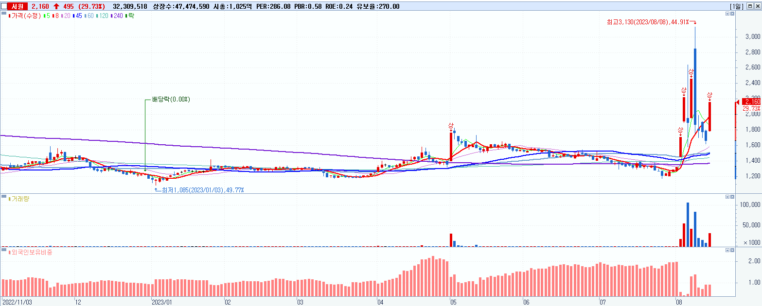 - 서원 (2,160원 ▲ 29.73% , 시총: 1,025억, 거래량: 32,309,518, 거래대금:646억)