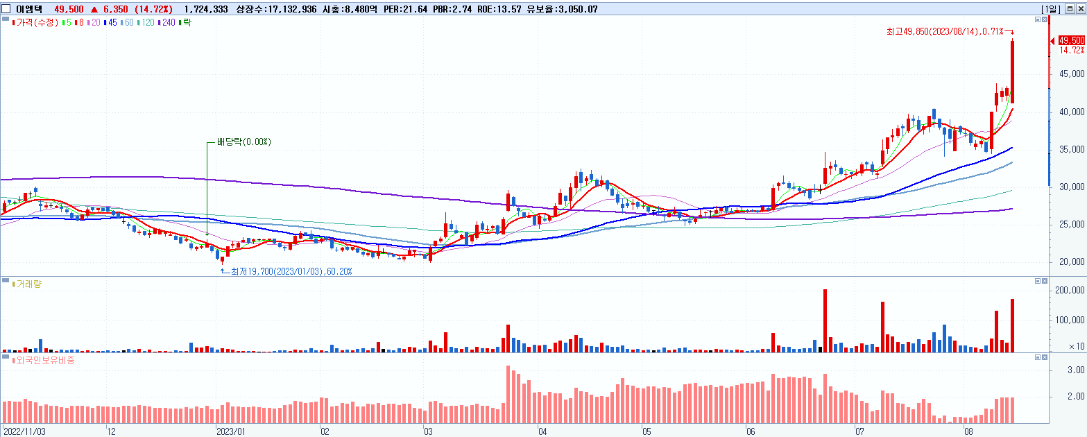 - 이엠텍 (49,500원 ▲ 14.72% , 시총: 8,481억, 거래량: 1,724,333, 거래대금:813억)