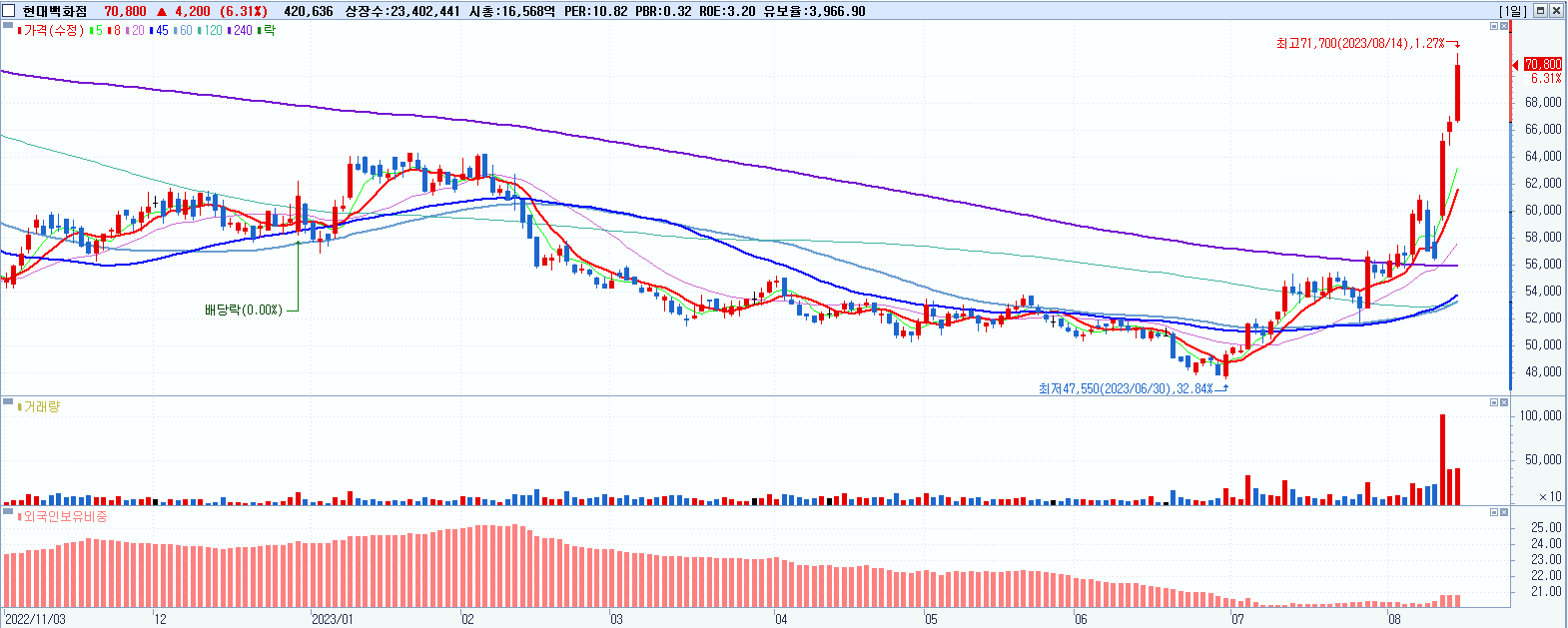 - 현대백화점 (70,800원 ▲ 6.31% , 시총: 16,569억, 거래량: 420,658, 거래대금:292억, KOSPI)