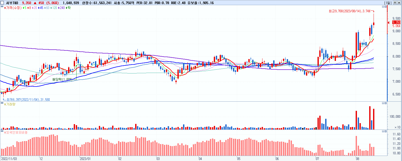 - 서부T&D (9,350원 ▲ 5.06% , 시총: 5,756억, 거래량: 1,648,947, 거래대금:155억, KOSDAQ)
